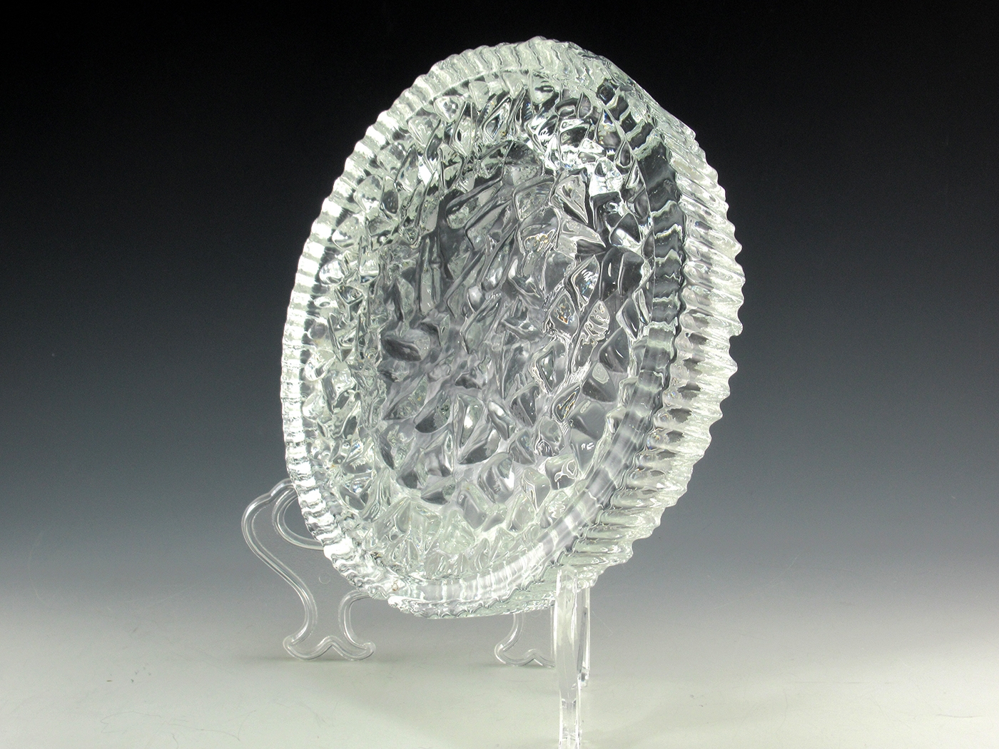Excellent and impressive ashtray. The glass has a very slight hint of blue, like the very cold ice in the arctic.