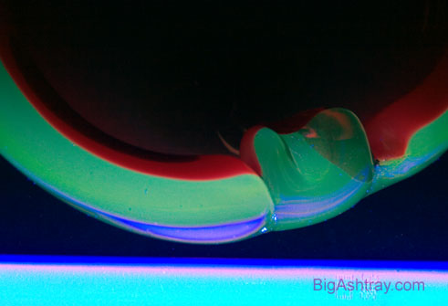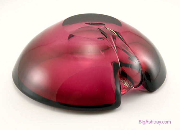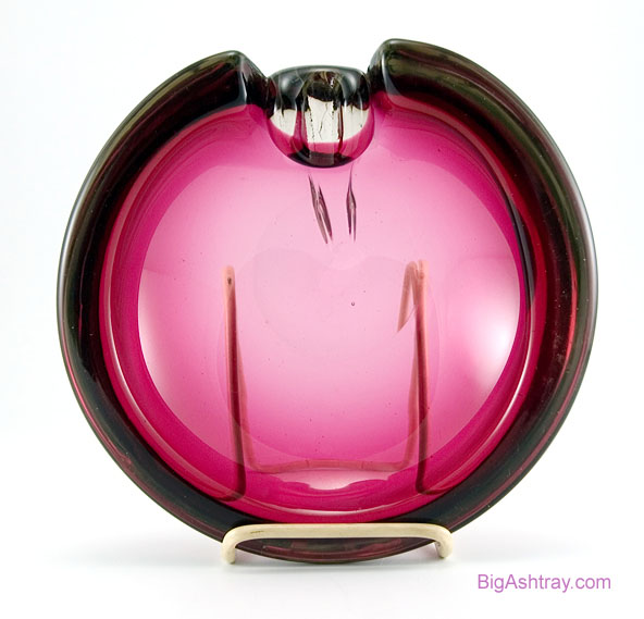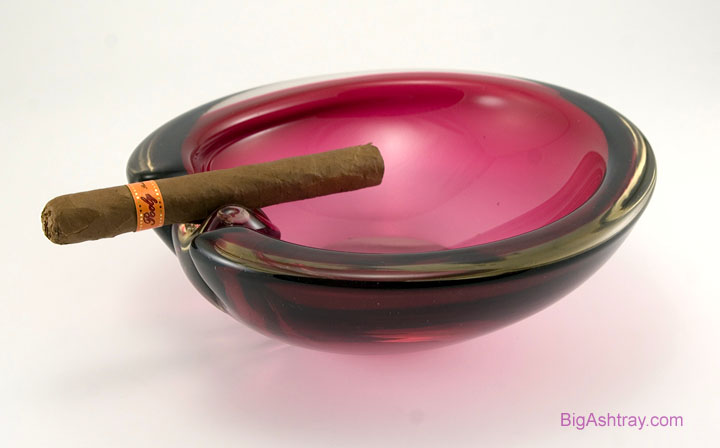 Thick walled dark cranberry glass encased in a light wheat, almost colorless glass with one big cigar rest. The rest cradles and floats the cigar over a 2½” deep bowl. Made for fine cigars. Great for smaller smokes and incense too. Weighs 5 lbs. Hefty, can’t get knocked around. Measures 8.25″ round, 2.75″ tall.