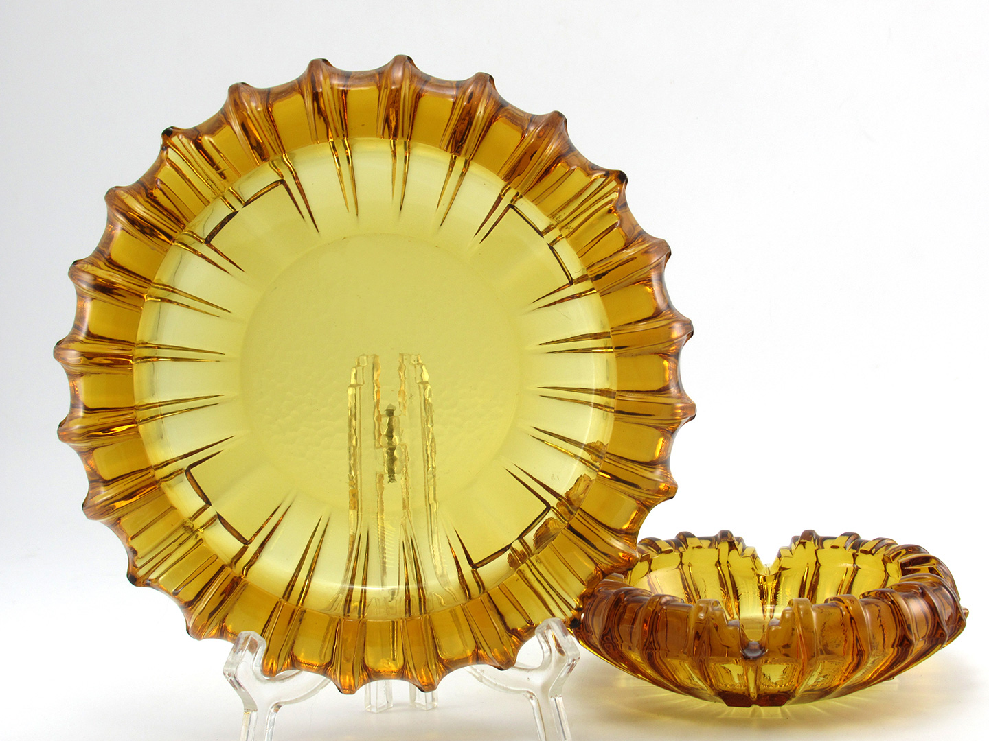 They are bright and shiny like the day they were made over 70 years ago (made in the 1940’s by Fostoria Glass, USA). The quality hand-made vintage glass in golden amber, a pleasing color that goes with any decor. Perfect for side tables.
