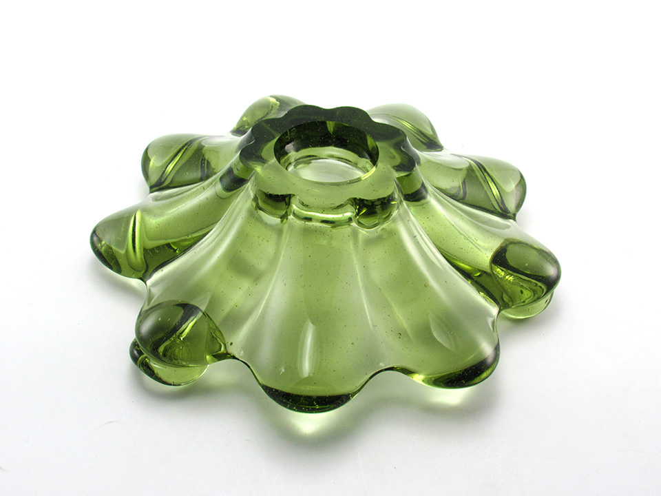 Hand-made in light smoke green seeded glass. Petal shaped base is polished smooth. Three hand-formed rests are applied to the bowl rim.