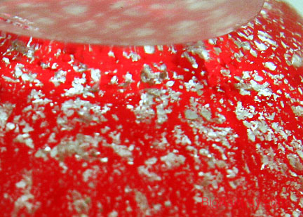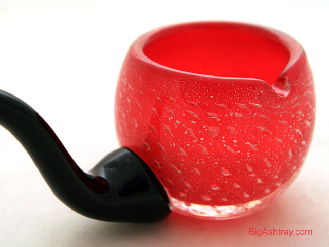 Solid black handle is attached to heavy cased glass bowl with intentional bubbles and a generous amount of silver/platinum foil flecks. Outer glass layer is colorless, inner layer is a deep cherry red.