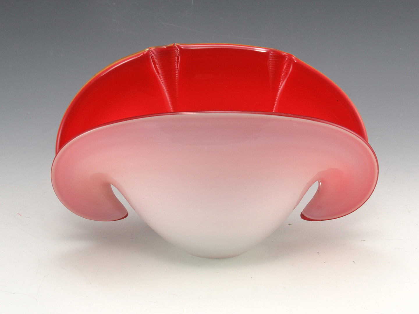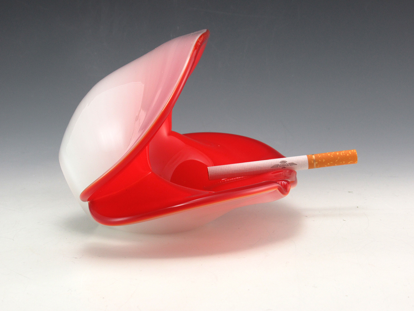 This clamshell ashtray vase was made by hand in triple cased glass; first layer is cherry red, second is white, and the final layer is clear. This color combination is great because it gives it a ‘Hot Lips’ look.