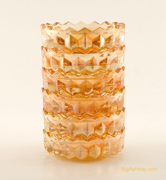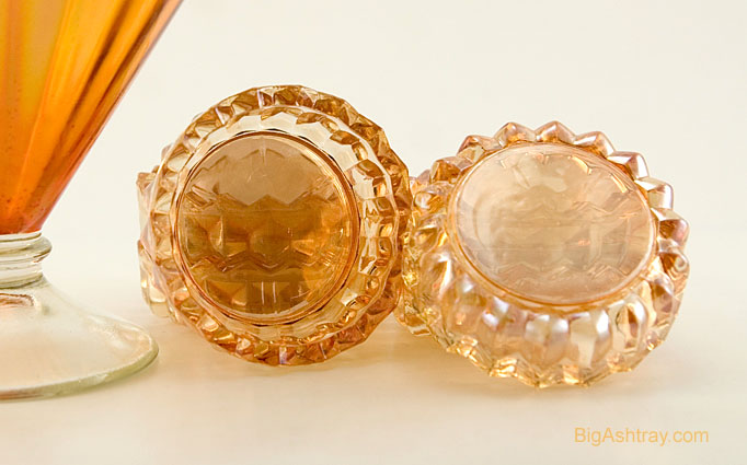 Gold luster flashed Depression glass deep dish coaster / ashtrays. Back in the day, coasters and ashtrays were often produced for both purposes. As a an ashtray, they fit comfortably in the palm of your hand and are suitable for small smokes and to hand-out at parties. As a coaster, they cradle stems with a 2½” wide foot or less. The bowl is ½” deep, handy for both uses.