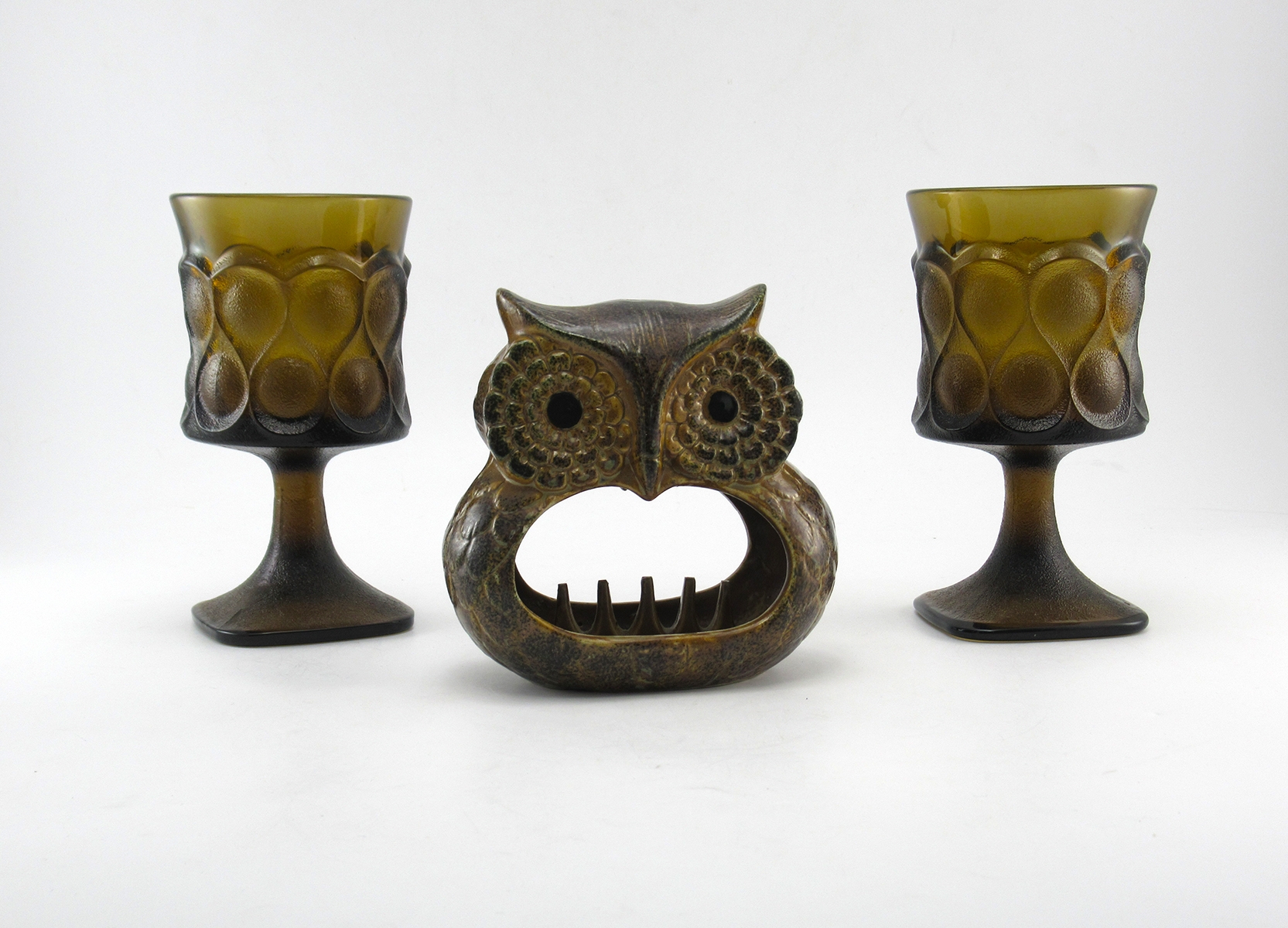 Probably made in the 1970’s. Everyone loved owls and mushrooms in the 1970’s. This is a fine example of mid-century owl art, well-designed and well-made. Likely made in the U.S.A. or Japan, no maker’s mark.