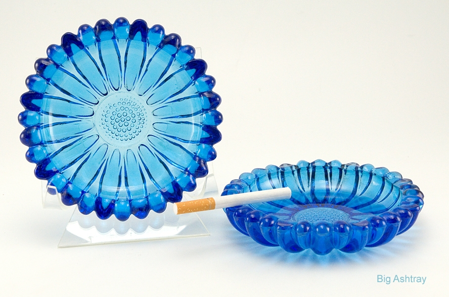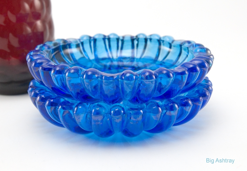 Vintage ashtray set in vivid blue glass with detailed deep pattern.